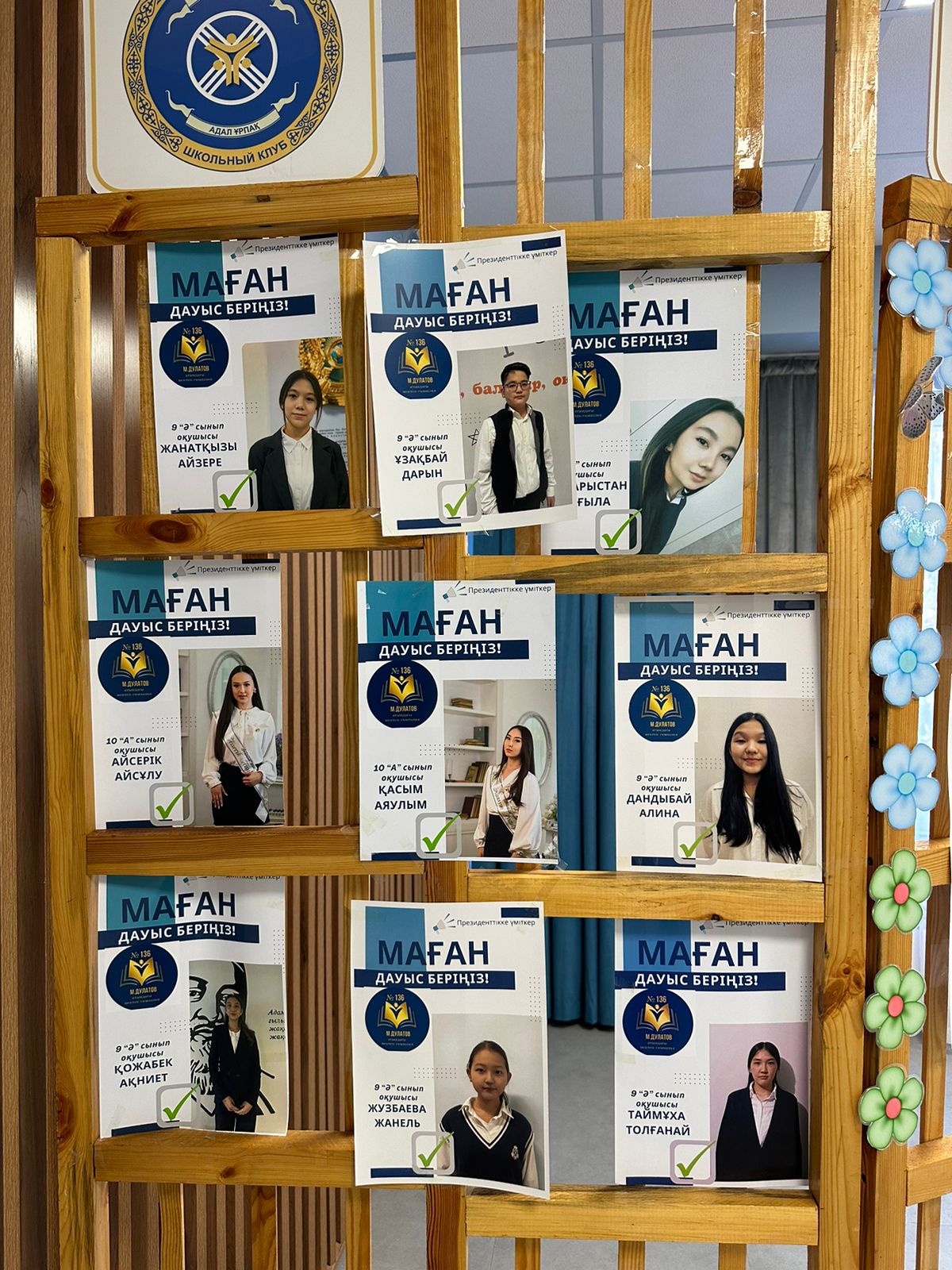 Президенттік сайлау 1 апта жалғасты. Қабырға газетіне президентікке үміткерлердің суреттері ілінді. 8-11 сынып оқушылары және мектеп мұғалімдері дауыс беріп, өз таңдауларын жасады. Дауыс беруге қатысқан сайлаушылардың жалпы саны – 186. Соның ішінде басым дауыс жинаған 10 «А» сынып оқушысы Айсерік Айсұлу (50, 26,8%) мектеп Президенті болып сайланды.