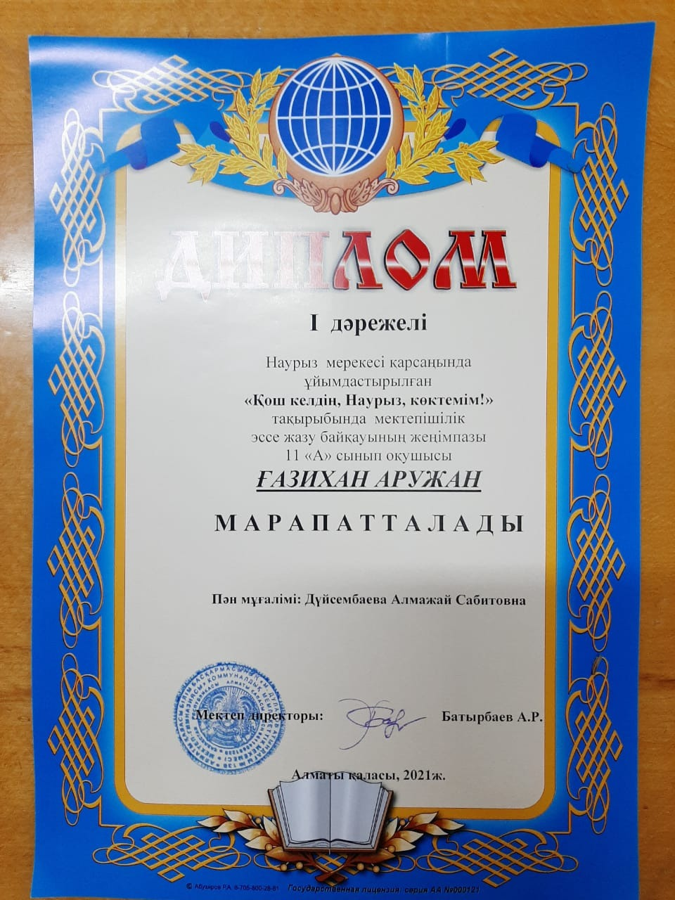 І дәрежелі диплом - 11 "А" сынып оқушысы ҒАЗИХАН АРУЖАН,