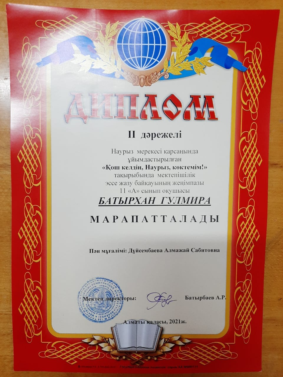 ІІ дәрежелі диплом - 11 "а" сынып оқушысы БАТЫРХАН ГУЛМИРА,