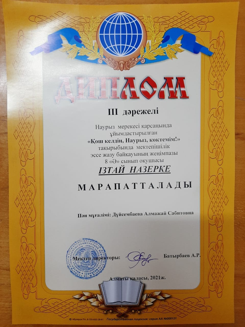 ІІІ дәрежелі диплом - 8 "Ә" сынып оқушысы ІЗТАЙ НАЗЕРКЕ марапатталды. Оқушыларымыздың жетістіктерін мақтан тұтамыз. Бағындырар белестерінің биік боларына сенеміз.