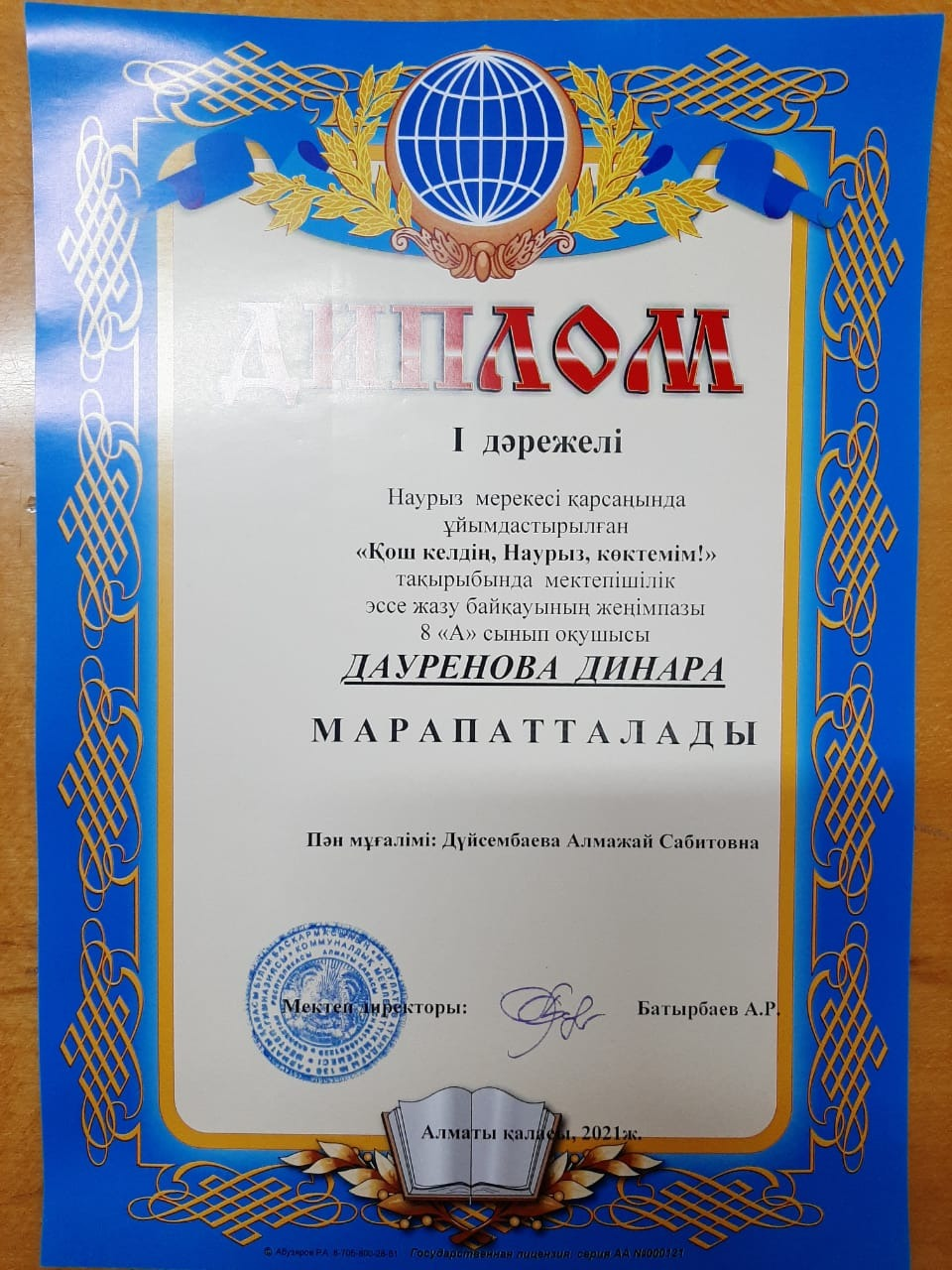 8"А" сынып оқушысы ДАУРЕНОВА ДИНАРА,
