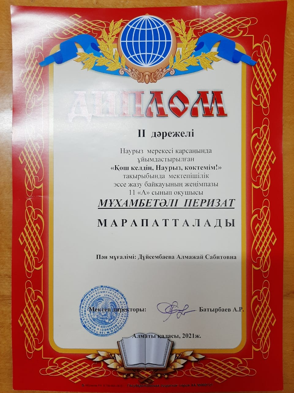 ІІ дәрежелі диплом - 11 "а" сынып оқушысы МҰХАМБЕТӘЛІ ПЕРИЗАТ,