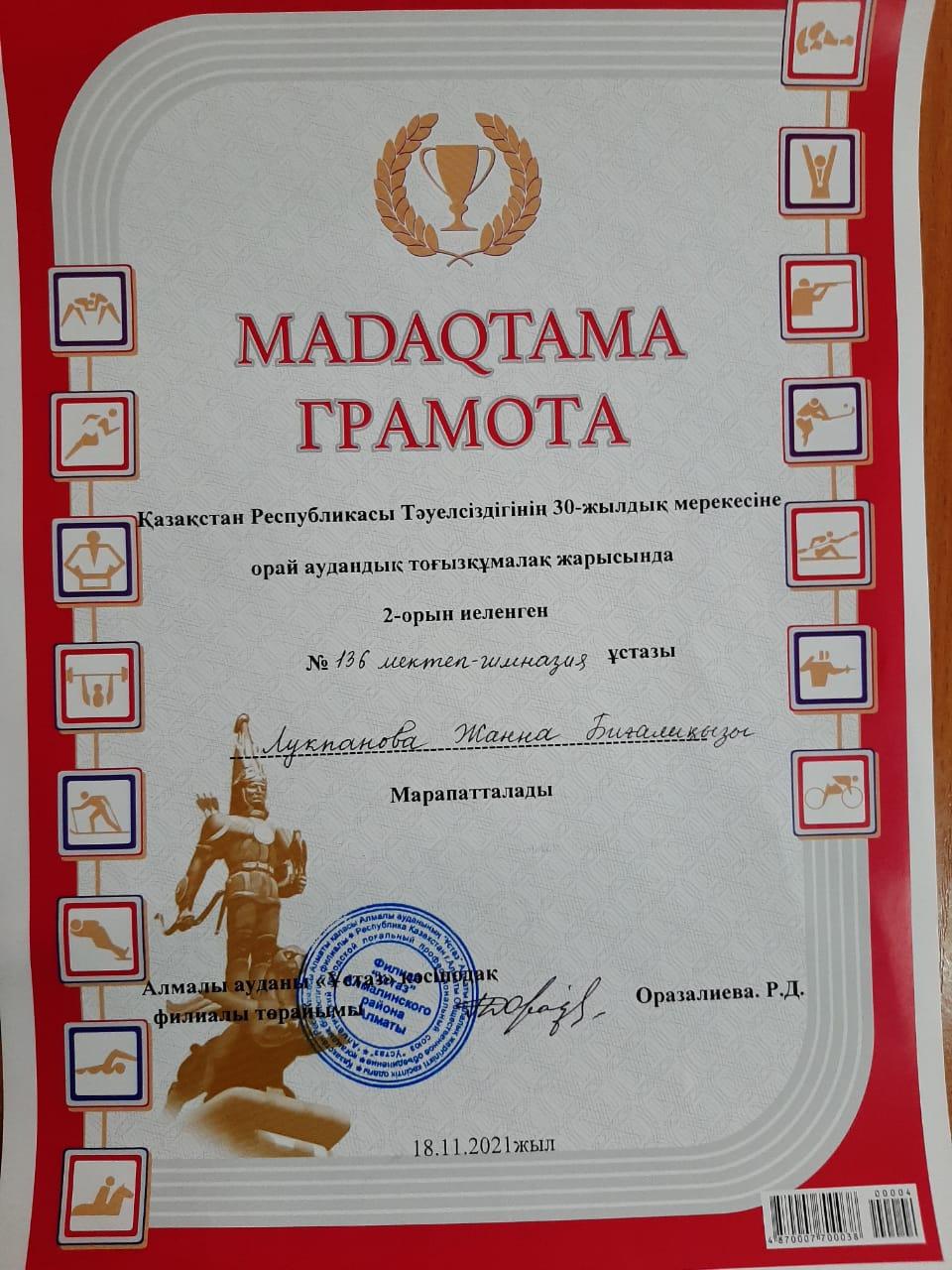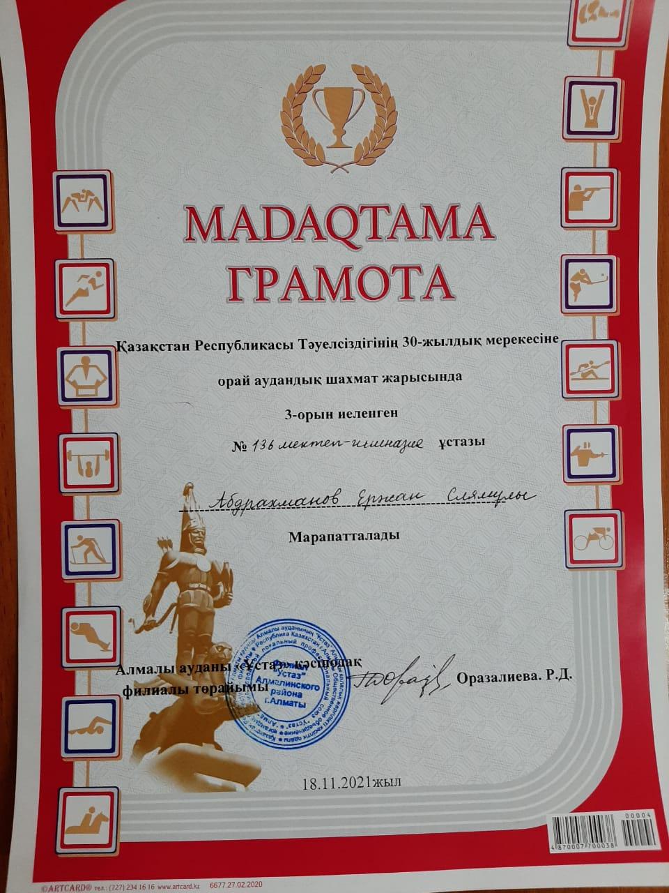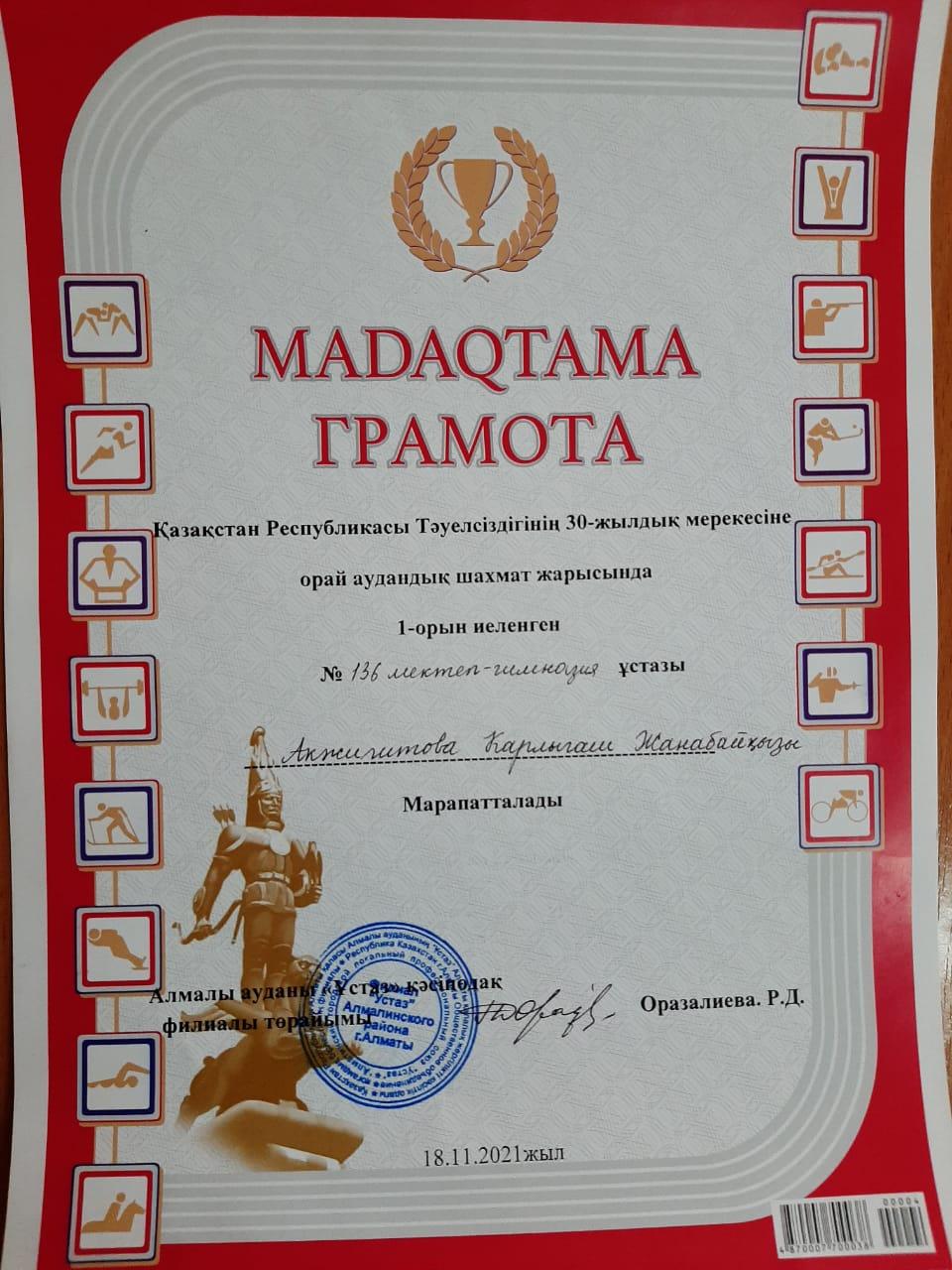 2021 жылдың 18 қараша күні Қазақстан Республикасы Тәуелсіздігінің 30 жылдық мерекесіне орай аудандық шахмат жарысында бастауыш сынып ұстазы Акжигитова Карлыгаш Жанабайқызы жүлделі І орын , дене шынықтыру пәні ұстазы Абдрахманов Ержан Слямұлы жүлделі ІІІ орын, тоғызқұмалақ жарысында дене шынықтыру пәні ұстазы Лукпанова Жанна Биғалиқызы жүлделі ІІ орын иеленіп, дипломмен және сыйлықтай марапатталды. Жеңістер құтты болсын!