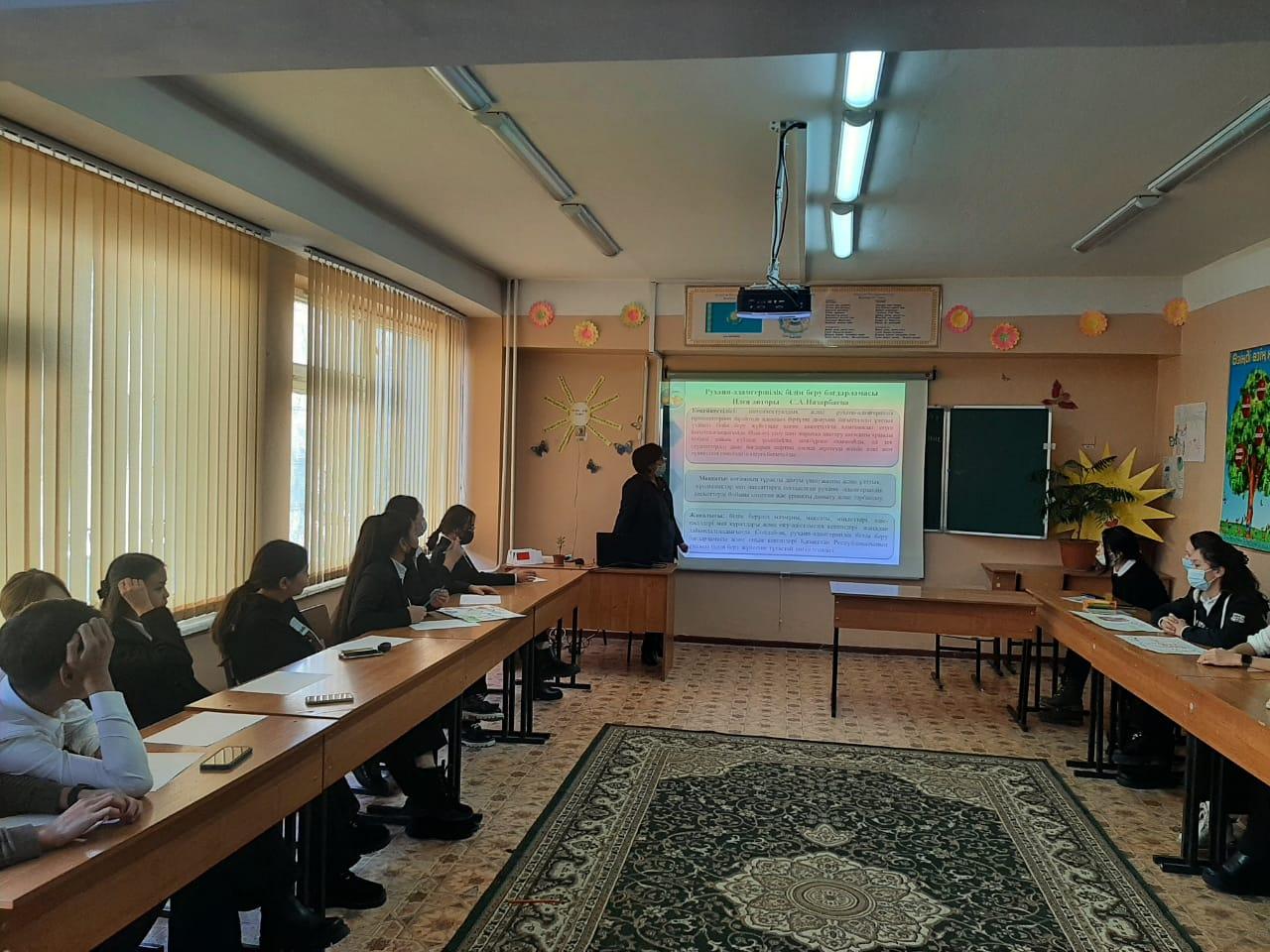 "Жалпыадамзаттық құндылықтар күніне орай "Өзін-өзі тану" пәнінің мұғалімі Сахибзадаева Дилла Хамитқызы 11-сынып оқушыларына арнап "Жалпы адамзаттық құндылықтар-бақытты өмірдің негізі" тақырыбында сабақ өткізді. Сабақ барысында білім алушыларға рухани-адамгершілік білім беру бағдарламасы бойынша бейне роликтер көрсетіліп, рухани-адамгершілік мазмұнында әңгіме жүргізілді.