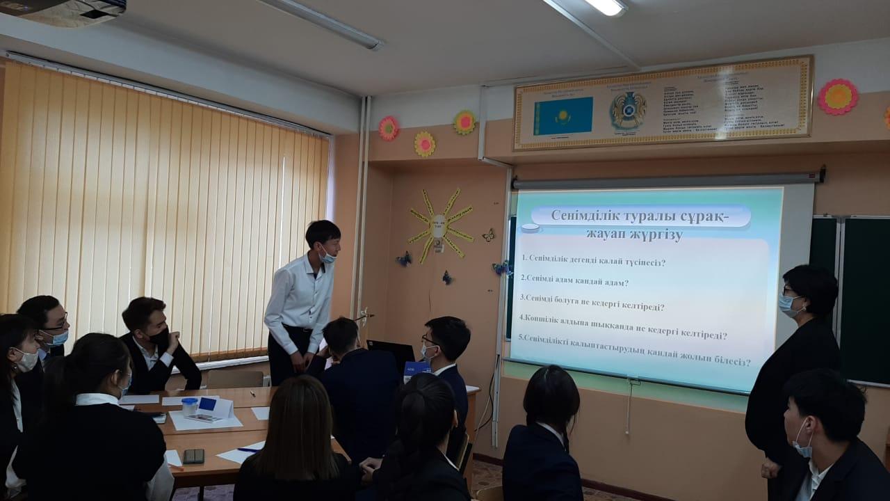 М.Дулатов атындағы №136 мектеп-гимназиясында 2021 жылдың 19 қараша күні мектеп психологтары Д.Сахибзадаева, З.Каримжиева 11 сынып оқушыларына «Сенімділік кілті» тақырыбында тренинг өткізді. Тренинг мақсаты: білім алушылардың өзіне деген сенімділікті қалыптастырып, пайдалы қарым-қатынас алгоритімін меңгерту. Өзге адамның пікіріне, бағасына, сынына тәуелділікті жеңу.Тренинг барысында қатысушылар топтарға бөлініп, сенімділік туралы сұрақ-жауап жүргізілді. «Суретті сал және екінші адамға бер», қорқынышты жою, «Жігерлену хаты», «Тілек-сандықшасы», т.б. жаттығулар жасалынды.