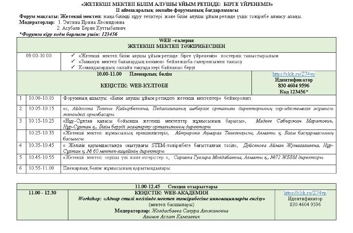 "Шебер педагог" санатты бастауыш сынып мұғалімі Нурсейтова Нуржанат Омирболатовна Нұрсұлтан қаласы мен Алматы қаласындағы ПЕДАГОГИКАЛЫҚ ШЕБЕРЛІК ОРТАЛЫҒЫ ұйымдастырған "Жетекші мектеп: білім алушы ұйым ретінде. Бірге үйренеміз" атты ІІ онлайн форумына қатысып, "Әліппе және әдебиеттік оқу сабақтарында оқушылардың функционалдық сауаттылығын арттыру жолдары" тақырыбымен шебер -сынып (мастер- класс) өткізді.