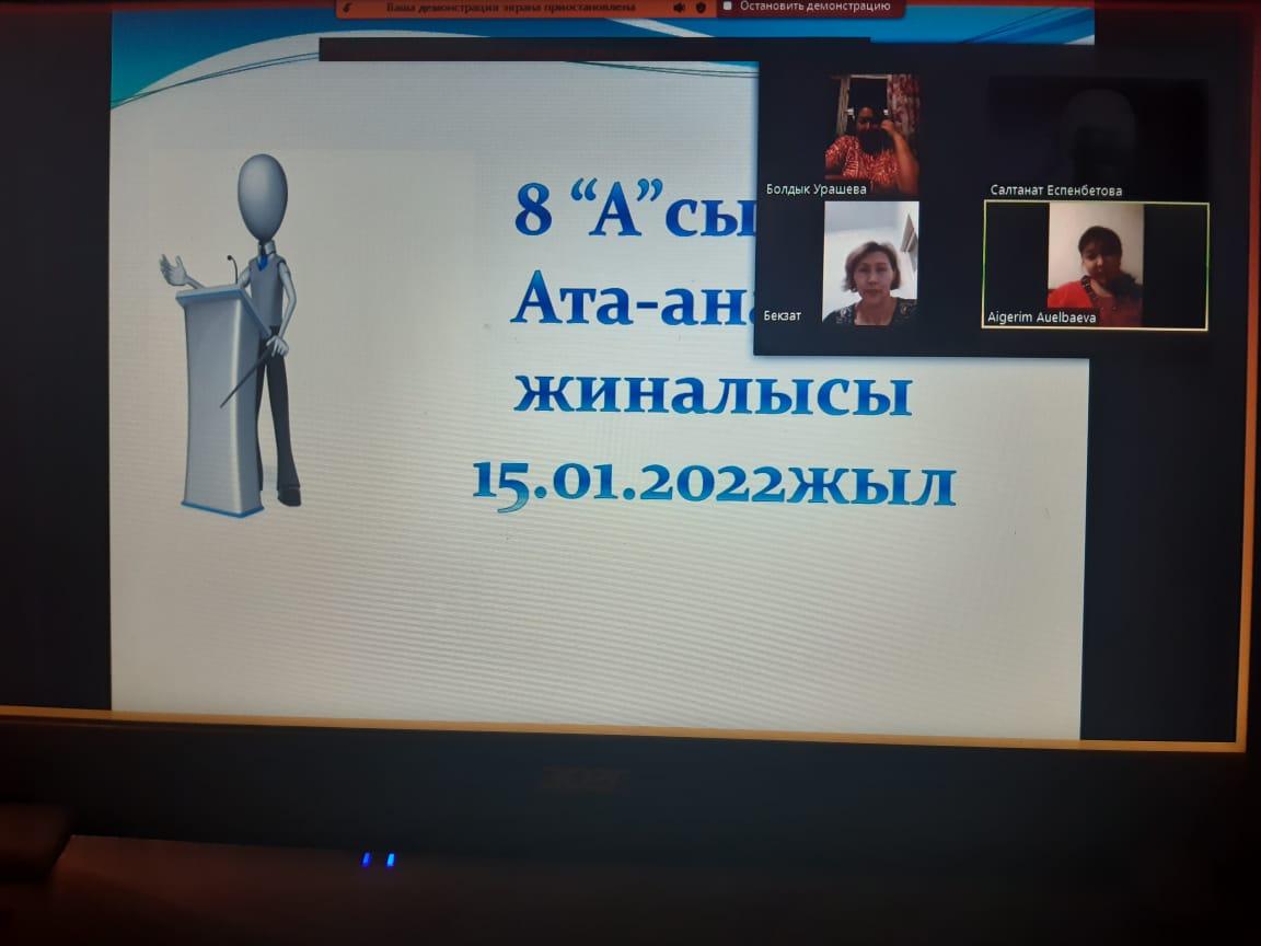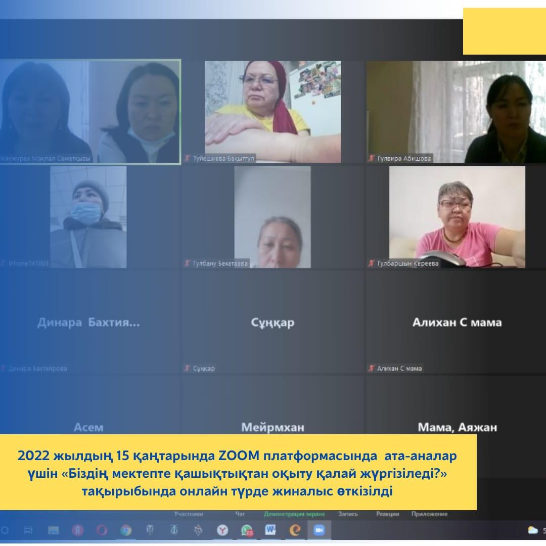 2022 жылдың 15 қаңтарында ZOOM платформасында ата-аналар үшін «Біздің мектепте қашықтықтан оқыту қалай жүргізіледі?» тақырыбында онлайн түрде жиналыс өткізілді.