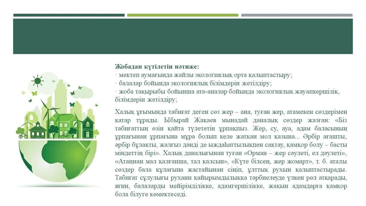 Мектептің негізгі міндеті – дені сау, қазіргі заман ағымына сай сауатты да инабатты ұрпақ тәрбиелеу, сонымен қатар баланың табиғатқа деген сүйіспеншілігін арттыру, әрі еңбекке баулу. Балаға табиғаттағы әрбір өсімдікті, жануарлармен таныстыру, көрсету арқылы ғана экологиялық тәрбие бере аламыз. Қорыта келе мектептен бастап қоршаған ортаны қорғауға, аялауға тәрбиеленген бала келешекте табиғат қамқоршысы болатыны сөзсіз.