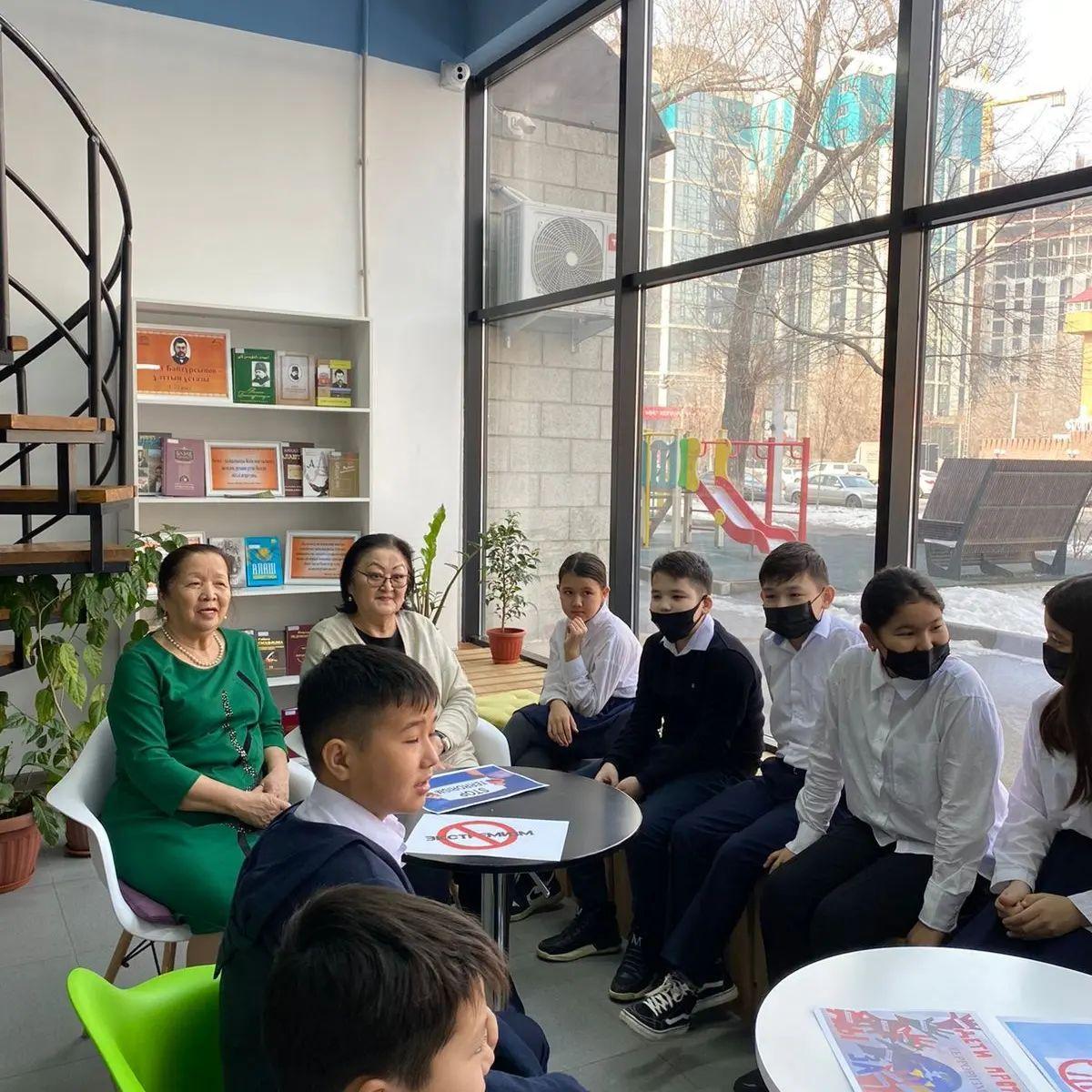 Іс-шараға Алмалы әкімдігі ардагерлер кеңесінен ардагер ұстаздар Зәуреш Ануарбекқызы, Күлпаш Дембайқызы және мектебіміздің 6-7 сынып оқушылары қатысты. Кітапхана меңгерушісі Исабекова Қуаныш Разаққызы шара мақсатымен таныстырып өтті.