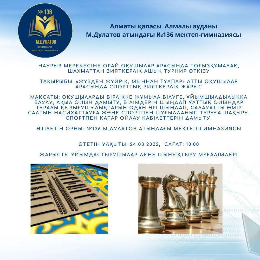 Наурыз мерекесіне орай оқушылар арасында тоғызқұмалақ, шахматтан зияткерлік ашық турнир өткізу