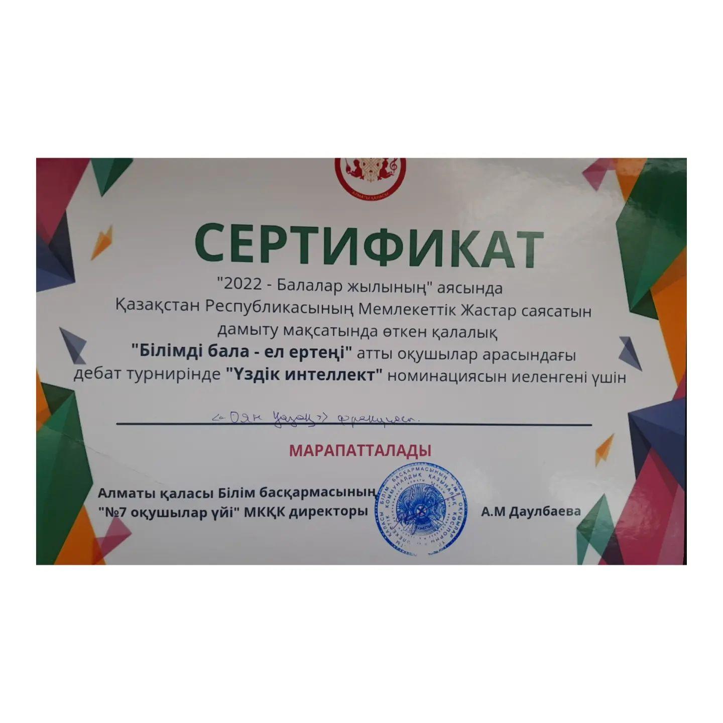 “2022 - балалар жылының” аясында ҚР Мемлекеттік Жастар саясатын дамыту мақсатында өткен қалалық “Білімді бала - ел ертеңі” атты оқушылар арасындағы дебат турнирінде “Үздік интелект” номинациясын иеленген “Оян, қазақ” фракциясы.
