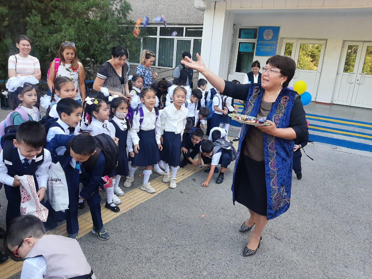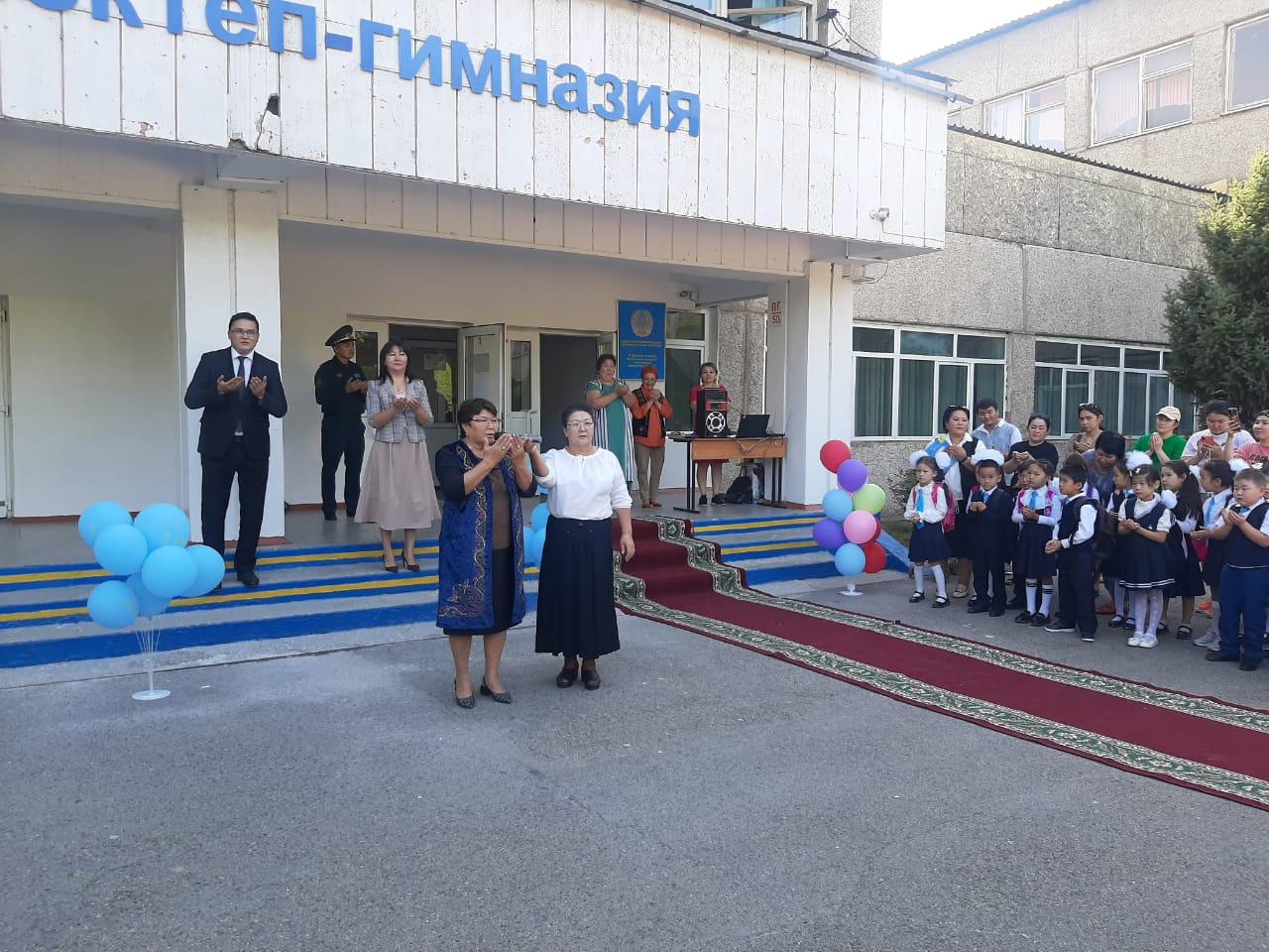 Мектеп-гимназия директоры Талғар Талғатұлы Төреқұлов 1-сынып оқушыларына жаңа оқу жылында сәттіліктер тілеп, ардагер ұстаздар Исагулова Зәуре Айтеевна мен Сатыбалдиева Сауле Касымхановна шашу шашып, ақ баталарын берді.