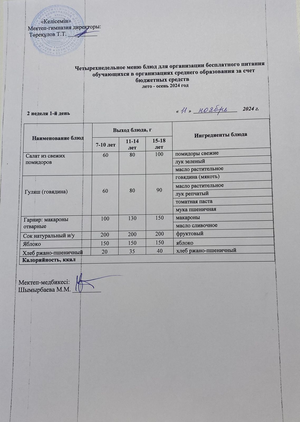 07.11.2024ж. асхана мәзірі