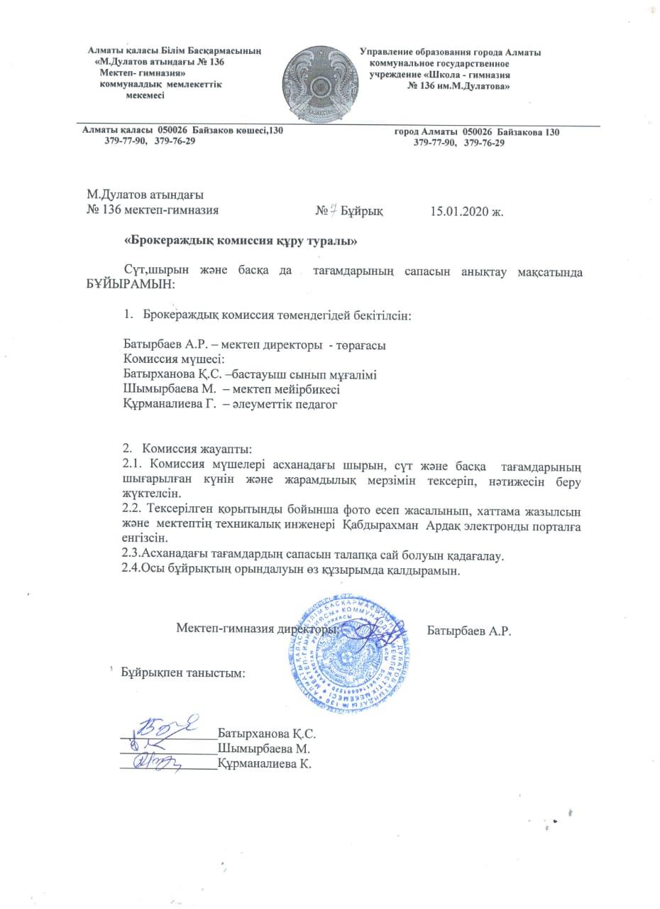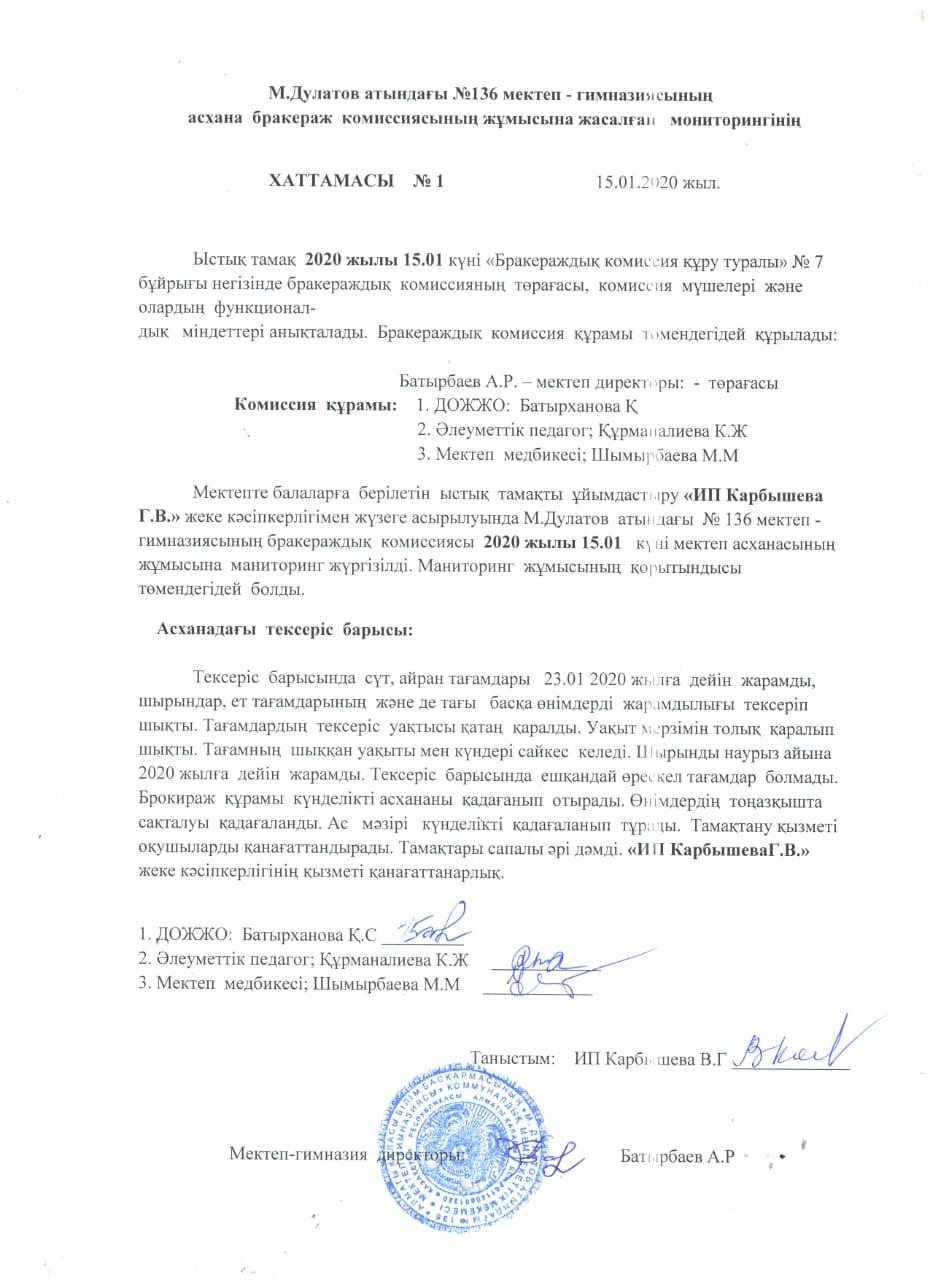 15 январь 2020 0 1 2 3 4 5 М.Дулатов атындағы 136 мектепте Ыстық тамақ 2020 жылы 15.01 "Бракераждық комиссия құру туралы №7 бұйрығы негізінде тексеріс болып өтті" Осы беттің QR-коды:QR-код этой страницы: