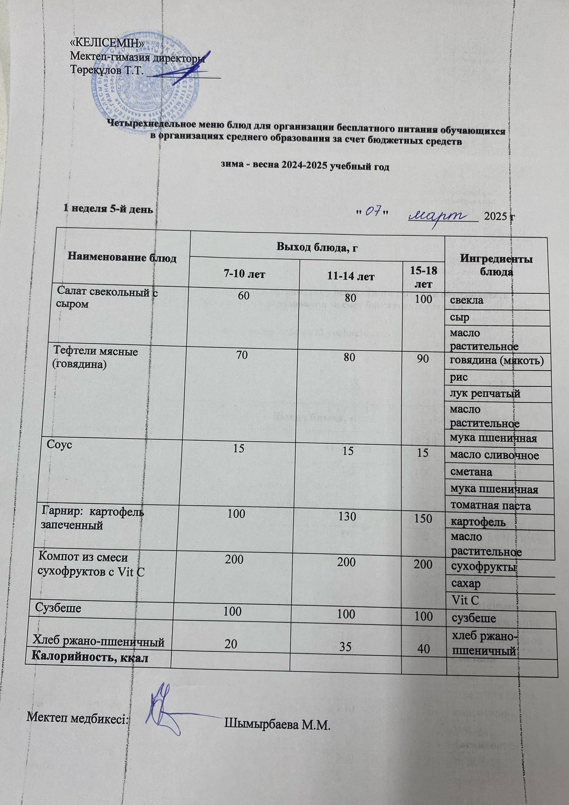 07.03.2025 ж. Мектеп асхана мәзірі