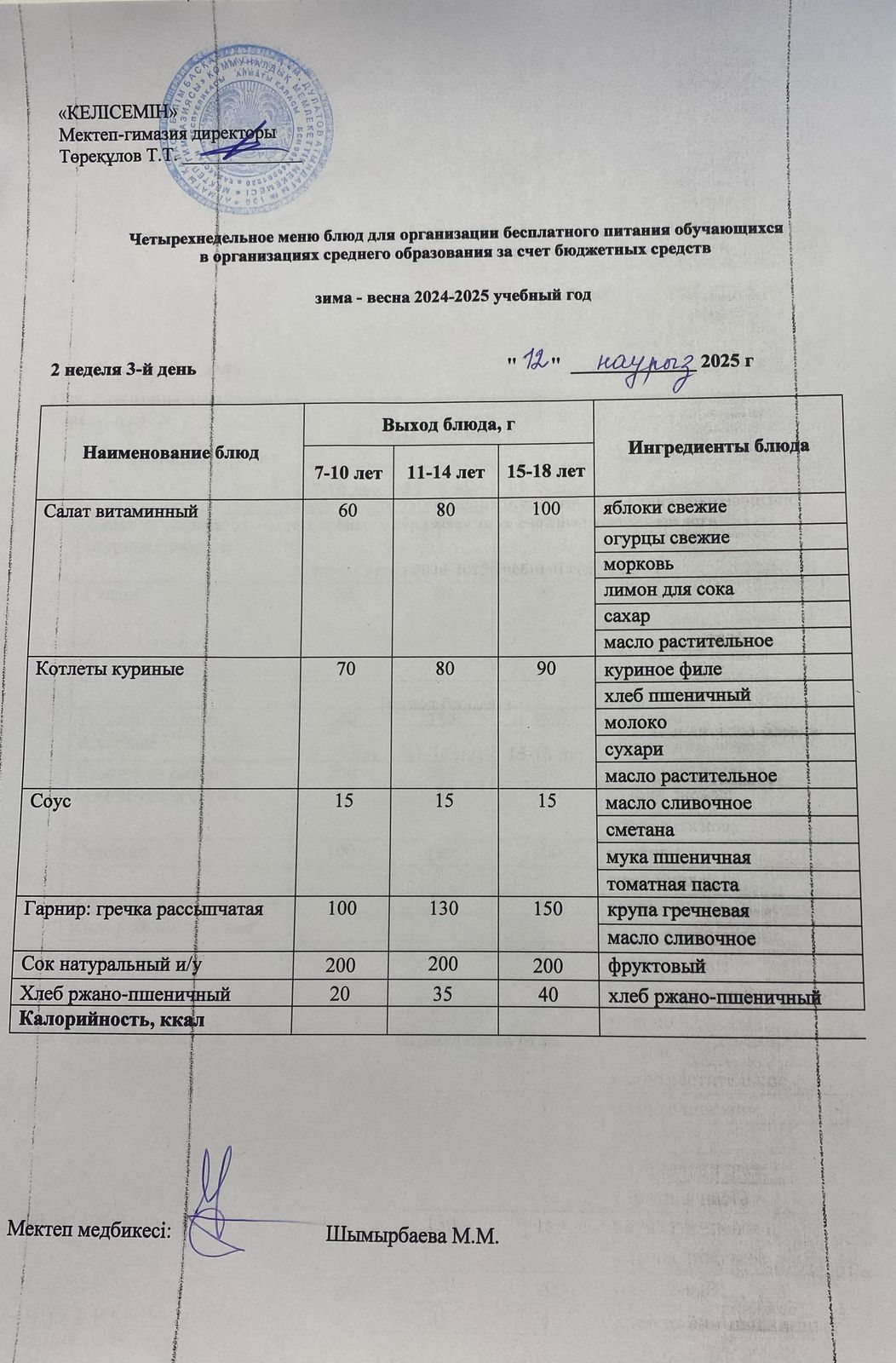 » 12.03.2025 ж. Асхана мәзірі
