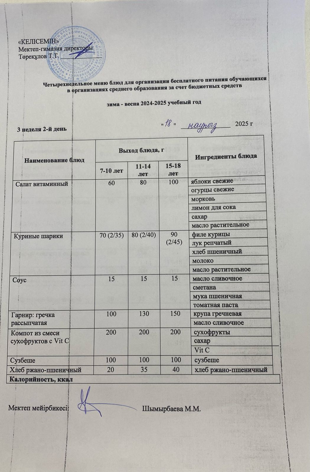 18.03.2025 ж. Мектеп асхана мәзірі