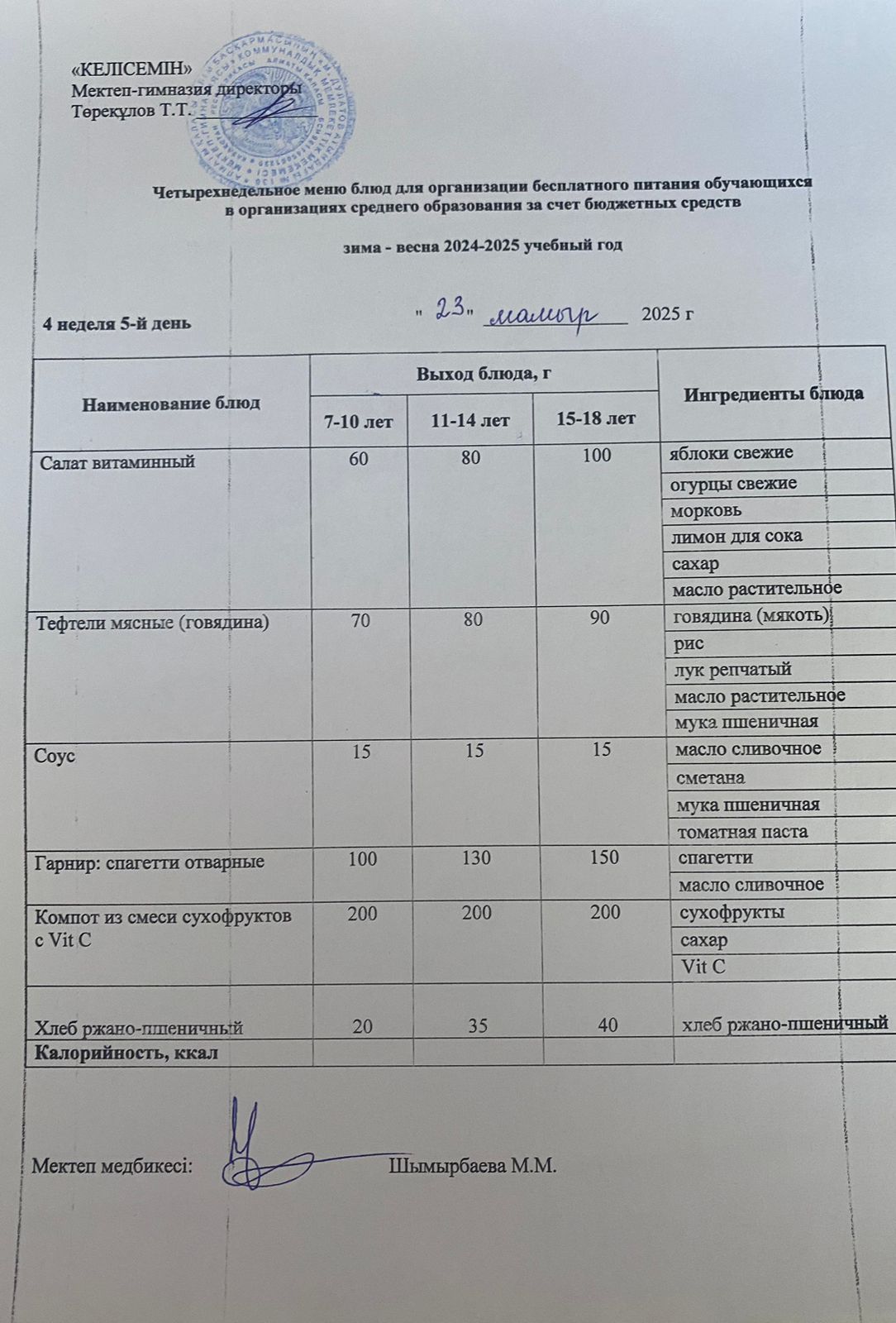 » 23.05.2025 ж. Мектеп асхана мәзірі