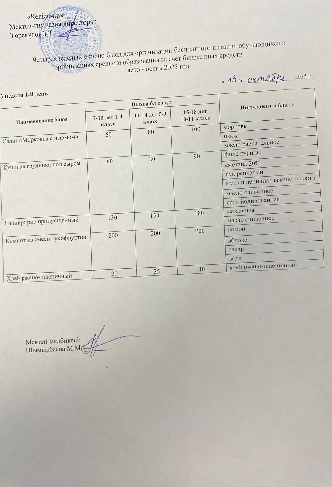 01.10.2025 ж. Мектеп асхана мәзірі